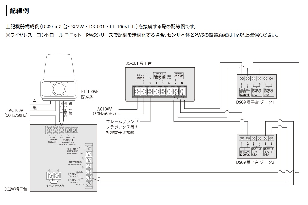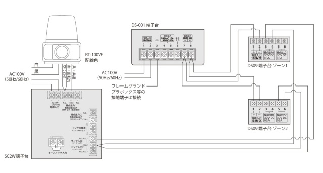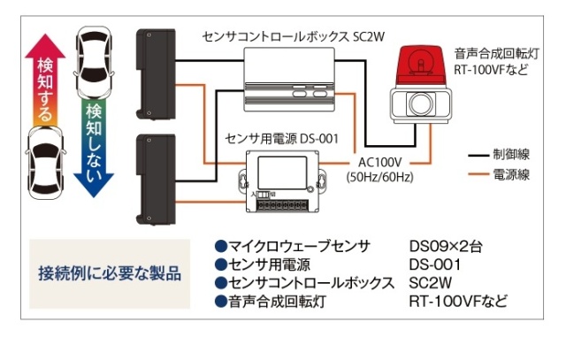 センサDS09、コントロールボックスSC2W、電源DS-001、回転灯RFT-100A(電子音)or RFV-100F(音声合成)の
